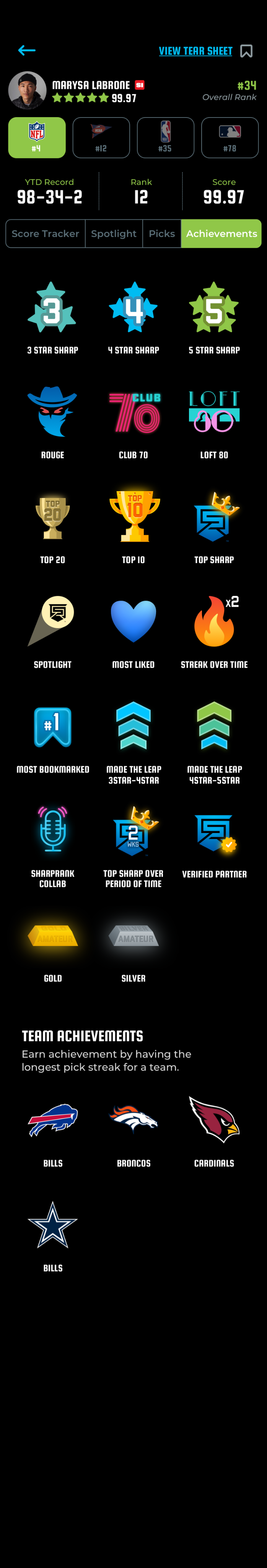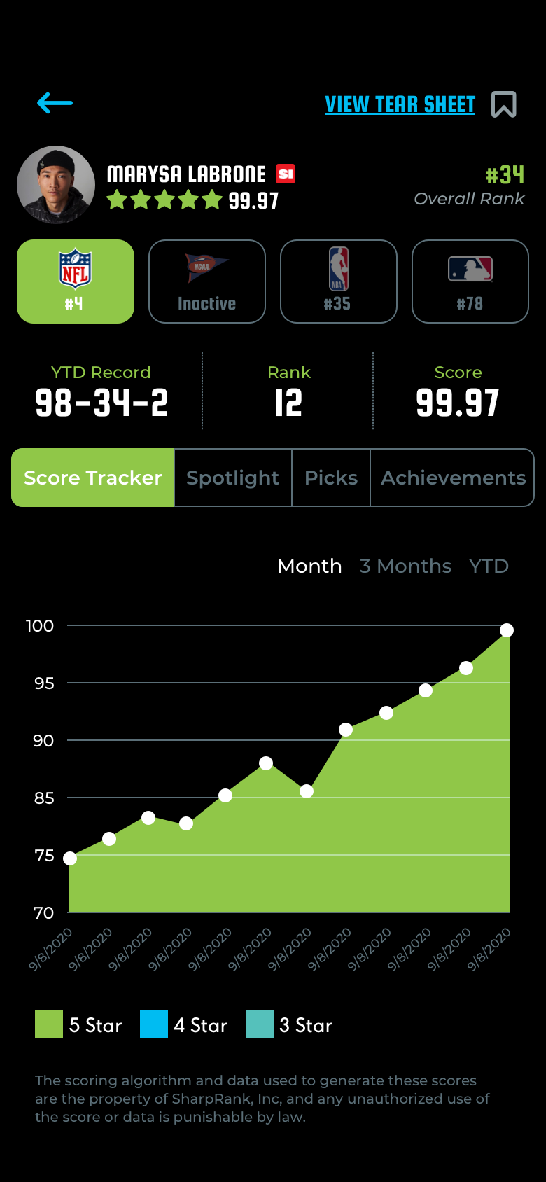 SharpRank developed a proprietary algorithm that objectively evaluates Sharps performance over time, generating insights and metrics for sports fans who are seeking to improve their sports bets. The app collects data from a variety of sources, crunching the numbers so users can clearly determine a Sharp’s accuracy and track record for various teams and leagues.
